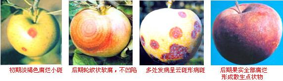 主要危害果實(shí),也可侵染枝干和果臺(tái)。自病斑中心剖開果實(shí),可見果肉自果面向果心成漏斗狀變褐腐爛。病組織帶有苦味。病斑邊緣紫紅色或黑褐色,中央凹陷,斑上黑色小點(diǎn)稀疏,呈同心輪紋狀排列,其下果肉局部壞死。枝干發(fā)病與果實(shí)癥狀相似。