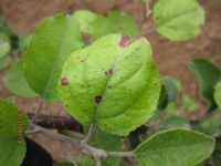 主要為害葉片,也為害嫩枝和果實(shí)。發(fā)病初期,葉片上出現(xiàn)褐色或深褐色小點(diǎn),后擴(kuò)大為直徑5-6毫米的病斑,周圍有紫紅色暈圈,邊緣清晰。天氣潮濕時(shí),病斑上長出黑色霉層。幼葉被害,有時(shí)葉片呈畸形。為害嚴(yán)重時(shí),被害葉干枯,提早脫落。果實(shí)被害,上生近似葉片上的斑點(diǎn)。枝條被害,也生褐色微凹陷的病斑,病斑周圍常產(chǎn)生裂紋。