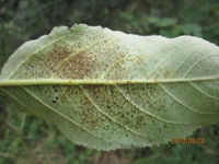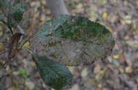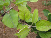 不同蘋果品種的感病性有明顯差異。高溫多雨,當(dāng)氣溫在10-20℃,光照較強(qiáng),癥狀較重。樹勢衰弱時(shí),癥狀較重,幼樹比成株易發(fā)病。土壤干旱,水肥不足時(shí)發(fā)病重。