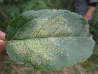 病菌在檜柏上為害小枝,即以茵絲體在菌癭中越冬。第二年春天形成褐色的冬孢子角。冬孢子柄被有膠質(zhì),遇降雨或空氣極潮濕的胺化膨大,冬孢子萌發(fā)產(chǎn)生大量擔(dān)孢子,隨風(fēng)傳播到蘋果樹上。銹菌侵染蘋果樹葉片、葉柄、果實(shí)及當(dāng)年新梢等,發(fā)病期持續(xù)一個(gè)月。