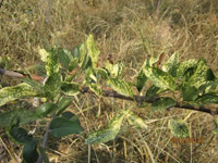 主要為害嫩枝、葉片、新梢,也為害花及幼果。病部滿布白粉是此病的主要特征。幼苗被害,葉片及嫩莖上產(chǎn)生灰白色斑塊,發(fā)病嚴(yán)重時(shí)葉片萎縮、卷曲、變褐、枯死,后期病部長出密集的小黑點(diǎn)。大樹被害,芽干癟尖瘦,春季發(fā)芽晚,節(jié)間短,病葉狹長,質(zhì)硬而脆,葉緣上卷,直立不伸展,新梢滿覆白粉。生長期健葉被害則凹凸不平,葉綠素濃淡不勻,病葉皺縮扭曲,甚至枯死。