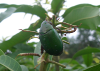 癥狀:金龜子的種類很多,危害芒果主要是銅綠麗金龜。銅綠麗金龜又名銅綠金龜子,是一種雜食性又是暴食性的害蟲,成蟲咬食花穗、嫩梢、幼果,食量大,數(shù)量多,危害嚴重。其幼蟲蠐螬俗稱雞蟲,是重要的地下害蟲。