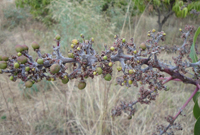 癥狀:是花期的主要病害,同時危害幼果、嫩葉,嚴重影響果實產(chǎn)量。該病主要為害花序、幼果和嫩葉。花序枝梗最容易受感染,梗上病斑褐色,病部常見白粉狀物,花梗環(huán)縊狀死亡,其上花朵、幼果隨之枯死脫落。嫩葉癥狀多在葉背,病葉常扭曲、畸形。幼果受害,果面出現(xiàn)近圓形的斑點,嚴重時幼果全部被白粉狀物覆蓋,造成大量落果。