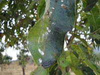 癥狀:介殼蟲為害葉片、枝條和果實。幼蟲和雌成蟲群集在芒果葉背或果實的表面,用口器插入組織內(nèi)吸取汁液,被害部分產(chǎn)生黃色的斑點,嚴重影響果皮的質(zhì)量。其排泄物能引起煤污病。