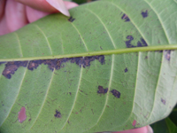 癥狀:煤煙病主要危害葉片、果實和枝梢。被害葉片見薄膜狀黑色霉層所覆蓋,外觀如被煙薰過一樣,有的霉層還有粘質(zhì)物,是刺吸式口器昆蟲分泌的“蜜露”,后期薄膜狀霉層可部分剝落。被害果實果面出現(xiàn)大小不等的黑色霉點,相互連成大的霉斑,嚴重的果面大部分或全果都被黑霉所覆蓋,影響果實外觀和商品價值。