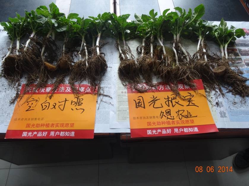 2014年4月24日在河北張家口市沽源縣黃蓋淖(久恩農(nóng)業(yè)開發(fā)有限公司)與公司技術(shù)總監(jiān)陳軍在馬鈴薯(荷蘭十五)上使用國(guó)光根寶75ml/畝溝施,2014年6月8日進(jìn)行觀察并從溝施根寶地塊和對(duì)照地塊分別隨機(jī)選取6個(gè)長(zhǎng)勢(shì)一致的植株,選取的每個(gè)植株均有6片葉,2個(gè)芽,測(cè)量根數(shù)量及根層數(shù)。