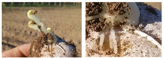 馬鈴薯植株生長(zhǎng)及塊莖膨大需要從土壤中吸收大量的養(yǎng)分和水分,根系的發(fā)育情況與吸收能力就決定了馬鈴薯植株生長(zhǎng)的健壯程度、塊莖的產(chǎn)量和品質(zhì)。馬鈴薯一般是先出芽,后長(zhǎng)根,如果根系生長(zhǎng)緩慢,會(huì)導(dǎo)致出芽生長(zhǎng)不良,莖細(xì)瘦、抗病能力弱易感染黑痣病、黑脛病等土傳性病害。因此,促進(jìn)馬鈴薯根系發(fā)育,提高根系吸收能力是馬鈴薯優(yōu)質(zhì)高產(chǎn)的關(guān)鍵。