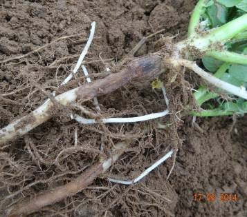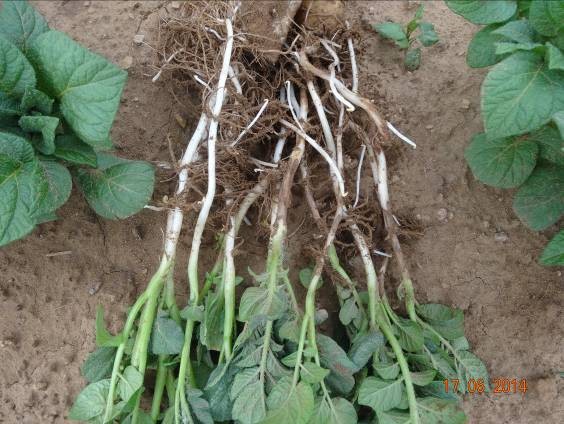 試驗(yàn)背景:隨著馬鈴薯面積的擴(kuò)大,連作障礙土傳性病害越來(lái)越嚴(yán)重,特別是像黑痣病、枯萎病近2年發(fā)生特別嚴(yán)重,而且治療非常困難。市面上防治這類病害的藥劑效果好的很少。2014年由于前期地溫比較低、濕度大,黑痣病感染比較嚴(yán)重,有的甚至已經(jīng)感染匍匐莖,嚴(yán)重影響到馬鈴薯的生長(zhǎng)。