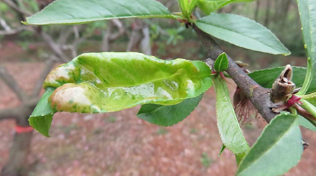 桃樹縮葉病是春季常見的一種病害,桃樹染病引起葉片腫脹皺縮,嚴(yán)重時病葉干枯脫落,對產(chǎn)量和品質(zhì)有較大的影響,還會影響花芽形成和來年的產(chǎn)量。