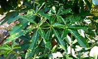2、根據(jù)調(diào)查發(fā)現(xiàn),成蟲產(chǎn)卵期和若蟲危害期與盆架子新芽、新葉的生長期吻合,因此針對(duì)易發(fā)區(qū)域,應(yīng)建議在新葉萌發(fā)期普遍噴施內(nèi)吸性的農(nóng)藥如崇刻(50%啶蟲脒水分散粒劑)2000-3000倍進(jìn)行預(yù)防。若已經(jīng)被危害的區(qū)域,鑒于木虱危害的隱蔽性以及噴藥難以接觸蟲體的特點(diǎn),建議選用內(nèi)吸滲透性藥劑,且最好在葉面出現(xiàn)“包狀物”而葉背面未出現(xiàn)黑褐色羽化孔前噴霧,建議用 “必治”(稀釋1000倍)與“依它(稀釋1000倍)”混合液葉面噴施,連用2-3次,間隔5-7天噴一次; 此方案用藥前后的對(duì)比如下(見圖4、圖5)。