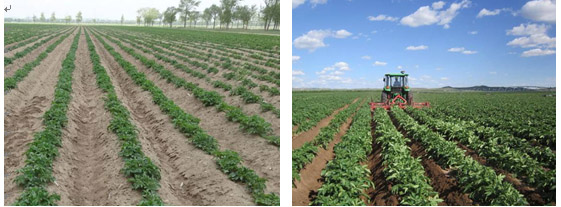馬鈴薯培土可使植株埋入土下的節(jié)數(shù)增多,增加匍匐莖的數(shù)量,形成更多和更大的塊莖,防止干旱裂畦,塊莖見光導(dǎo)致薯皮發(fā)青。在苗期當(dāng)株高10~15厘米左右時,結(jié)合中耕除草進行第一次適當(dāng)培土,做到鋤通壟背、靠緊壟眼,除盡雜草,不傷根苗;在苗高25厘米左右時進行第二次中耕培土,培土5~7厘米;在開花前進行第三次中耕鋤草,高培土,以利于結(jié)薯。