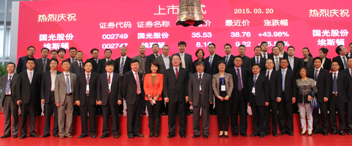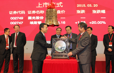 2015年3月20日上午,四川國光農(nóng)化股份有限公司上市儀式在深圳證券交易所隆重舉行。公司董事長(zhǎng)顏昌緒,資陽市委書記、市人大常委會(huì)主任周喜安、農(nóng)業(yè)部藥檢所總農(nóng)藝師季穎、中國農(nóng)藥工業(yè)協(xié)會(huì)會(huì)長(zhǎng)孫叔寶、中共資陽市委常委郎寬、資陽市人民政府副市長(zhǎng)毛紹百、簡(jiǎn)陽市人民政府市長(zhǎng)趙春淦等政府主要領(lǐng)導(dǎo)及公司董事、監(jiān)事、高管出席了上市儀式。