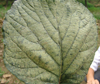 4月中旬,病原菌由葉背面開(kāi)始侵染,為侵染的初期。5-6月份,氣溫20-24℃,更有利于侵染,此時(shí)期是侵染高峰期。7-8月為發(fā)病高峰期(此時(shí)期高溫高濕)葉部癥狀明顯,開(kāi)始是小病斑,后逐步擴(kuò)大,葉片后期干枯,大量落葉。到8月下旬開(kāi)始大量落果。