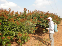 對(duì)于花帶葉和沖梢的類型,進(jìn)行脫小葉處理。在荔枝妃子笑品種上進(jìn)行化學(xué)藥劑脫小葉處理:國(guó)光乙烯利3-5ml/15kg,配合磷鉀營(yíng)養(yǎng)。白糖罌等品種上不進(jìn)行化學(xué)藥劑脫小葉處理,一般進(jìn)行人工摘葉處理。