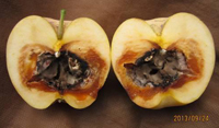只危害果實(shí)。分為霉心型和心腐型。初期心室組織變褐壞死,后向外擴(kuò)展,果肉變褐色或者深褐色,味苦,可從果柄洼出爛透。心室內(nèi)充滿白色、黑褐色、青綠色或者粉紅色霉層,以粉紅色霉層最常見。幼果發(fā)病,內(nèi)外常包敷紅粉。北斗、元帥系品種的病果易脫落,青香蕉的病幼果多在樹上變黃,國光則干縮成黑色小僵果,掛在樹上經(jīng)冬不落。