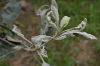 主要為害嫩枝、葉片、新梢,也為害花及幼果。病部滿布白粉是此病的主要特征。幼苗被害,葉片及嫩莖上產(chǎn)生灰白色斑塊,發(fā)病嚴(yán)重時(shí)葉片萎縮、卷曲、變褐、枯死,后期病部長出密集的小黑點(diǎn)。大樹被害,芽干癟尖瘦,春季發(fā)芽晚,節(jié)間短,病葉狹長,質(zhì)硬而脆,葉緣上卷,直立不伸展,新梢滿覆白粉。生長期健葉被害則凹凸不平,葉綠素濃淡不勻,病葉皺縮扭曲,甚至枯死。