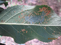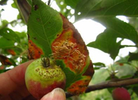 病菌在檜柏上為害小枝,即以茵絲體在菌癭中越冬。第二年春天形成褐色的冬孢子角。冬孢子柄被有膠質(zhì),遇降雨或空氣極潮濕的胺化膨大,冬孢子萌發(fā)產(chǎn)生大量擔(dān)孢子,隨風(fēng)傳播到蘋果樹上。銹菌侵染蘋果樹葉片、葉柄、果實(shí)及當(dāng)年新梢等,發(fā)病期持續(xù)一個(gè)月。