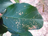 蘋果綿蚜一年發(fā)生8—9代,主要以一齡和少數(shù)二齡若蟲在樹體上群聚越冬。越冬的部位大多在中、下部的主枝和大枝上。在枝干上有愈傷組織、剪鋸口、皮隙縫等處或在根瘤上群集。越冬的成活率隨越冬群體的大小而不同,群體越大,成活率越高。來年春季,在4月初開始為害。5月上、中旬為田間蔓延階段,6月—7月中旬是該蟲大量繁殖,蔓延、擴(kuò)散的重要時(shí)期,往往綿狀物累累全樹,造成嚴(yán)重為害。因此5月份蟲群尚未擴(kuò)散是防治的關(guān)鍵時(shí)期。7月下旬—8月中旬蟲口數(shù)量迅速下降,其原因是高溫和寄生蜂的原故。