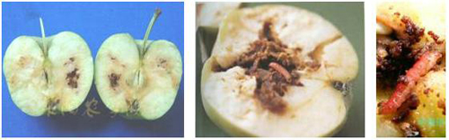 被害果果面有針頭大小的蛀(入)果孔,由孔流出淚珠狀汁液,干涸后呈白色蠟狀物。幼蟲取食果肉形成彎曲縱橫的蟲道,蟲糞留在果內(nèi)呈“豆沙餡”狀。幼果被害后,生長發(fā)育不良,形成凹凸不平的“猴頭果”;后期受害的果實(shí),果形變化不大;被害果大多有圓形幼蟲脫果孔,孔口常有少量蟲糞,由絲粘連。
