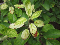 多從新梢嫩葉開始,初期葉肉變黃,葉脈持綠,隨病勢(shì)葉片變成黃白色,重時(shí)葉片邊緣枯焦,新梢頂端枯死。