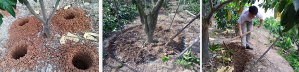 為了促進芒果根系正常生長和再生,在不同時期應(yīng)對果園做深耕和翻土處理。冬季(或采果修剪后)應(yīng)結(jié)合深翻改土,沿樹冠垂直線下挖(60cm深、30cm寬)環(huán)溝、對溝或圓形溝,切斷土壤下層的粗根,經(jīng)曬五、六天,然后施采果肥,用表土和植物殘體加以回填。結(jié)合清園,進行中耕翻土(20cm深),以切斷表土的吸收根,減弱地下部分對地上部分水分和養(yǎng)分輸送,有利地上部分營養(yǎng)物質(zhì)積累,促進花芽分化。