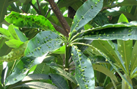 盆架子木虱,刺吸式口器害蟲,屬同翅目、木虱科昆蟲,也是一種典型的造癭昆蟲。在廣東、海南、福建地區(qū)的盆架子上危害較重。受危害的盆架子,葉片正反面突起呈囊狀蟲癭(見圖1)。 葉片卷曲,皺縮。若蟲分泌蜜露堵塞葉片的氣孔,既嚴(yán)重影響葉片的光合作用和呼吸租用,還容易誘發(fā)煤污病,影響植株正常生長,降低其觀賞價(jià)值。