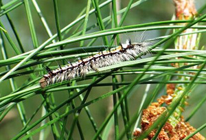松毛蟲繁殖力強,產(chǎn)卵量大,卵多成塊或成串產(chǎn)在未曾受害的幼樹針葉上。1-2齡幼蟲有群集和受驚吐絲下垂的習性;3齡后受驚擾有彈跳現(xiàn)象;幼蟲一般喜食老葉。成蟲有趨光性,以20時活動最盛。